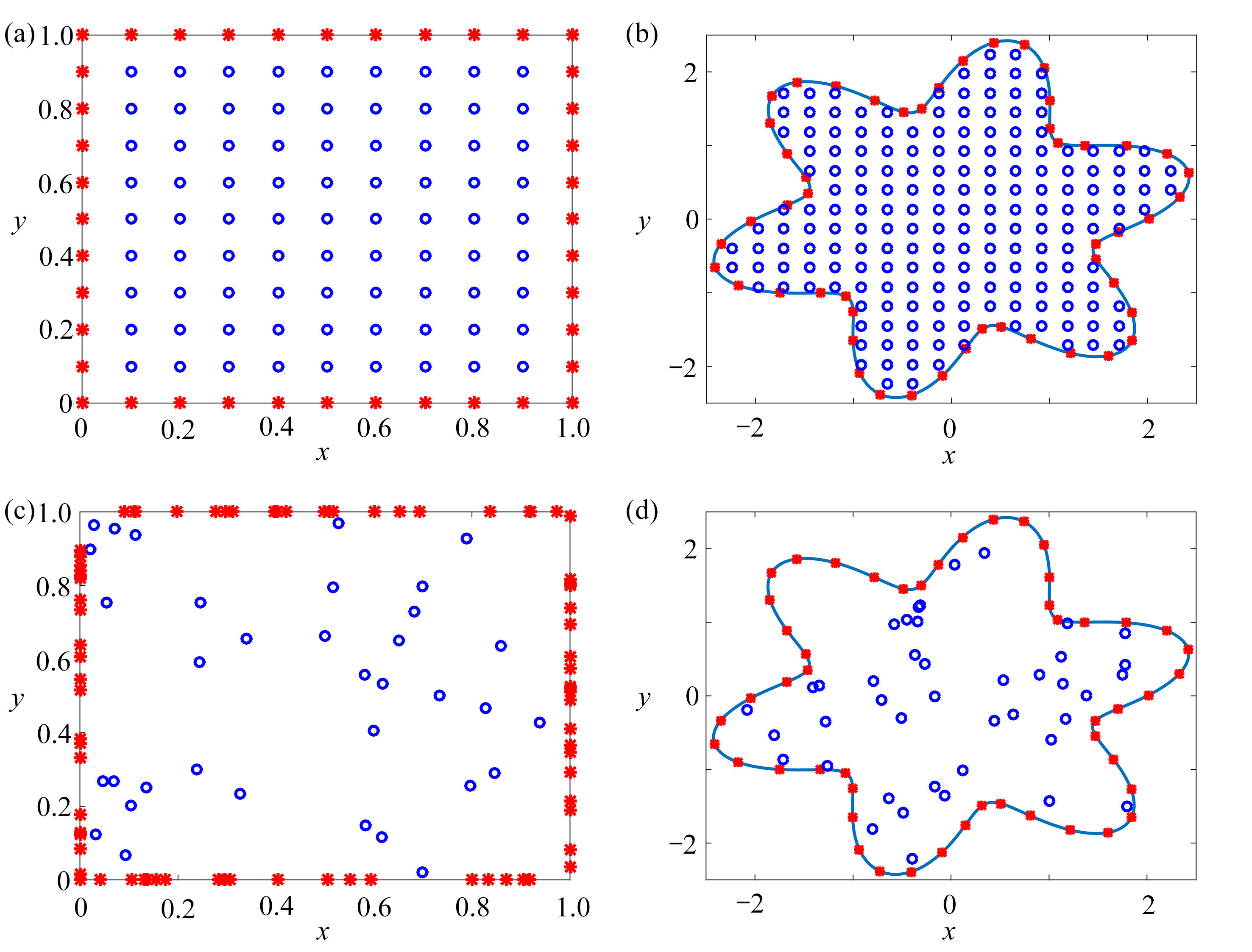 Figure 1. The collocation point diagram: (a) the regular domain with regular points; (b) the irregular domain with regular points; (c) the regular domain with random points; (d) the irregular domain with random points (blue circles: interior collocation points; red stars: boundary collocation points)