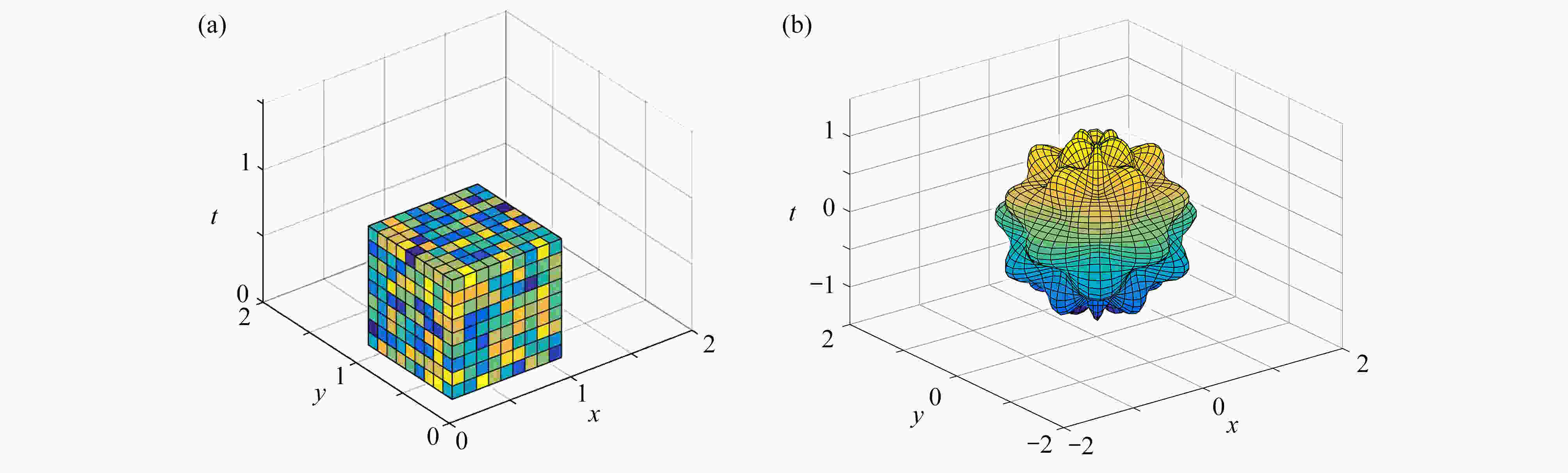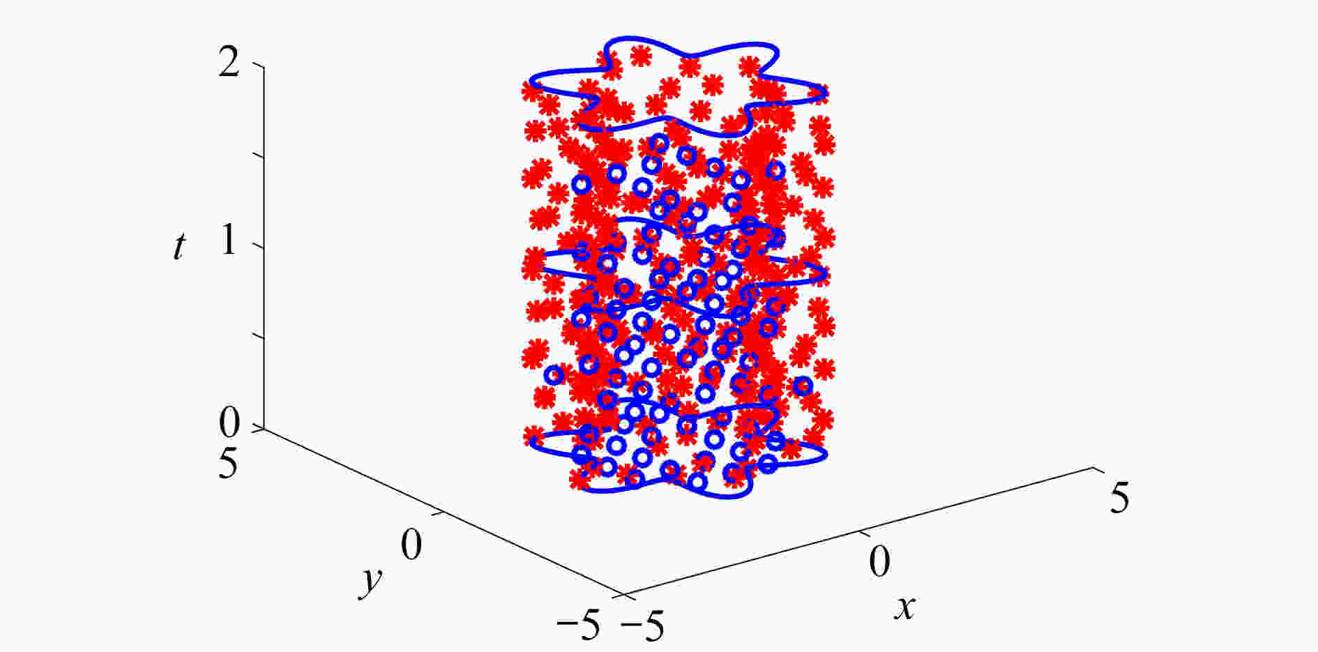 $n_{{{\rm{i}}}}=3\;819,\; n_{{{\rm{d}}}}=5\;220,\; n_{{{\rm{t}}}}=1\;919,\; {\tau}=1$ for cubic and bumpy-shaped domainsorder cubic ${\delta_{\rm{RMSE1}}}$ bumpy-shape ${\delta_{\rm{RMSE2}}}$ CPU time t/s 4 7.65E−4 1.21E−4 0.375 6 4.74E−5 1.84E−6 1.886 8 2.42E−6 5.13E−9 10.290 10 1.31E−7 5.13E−10 38.707 表 2