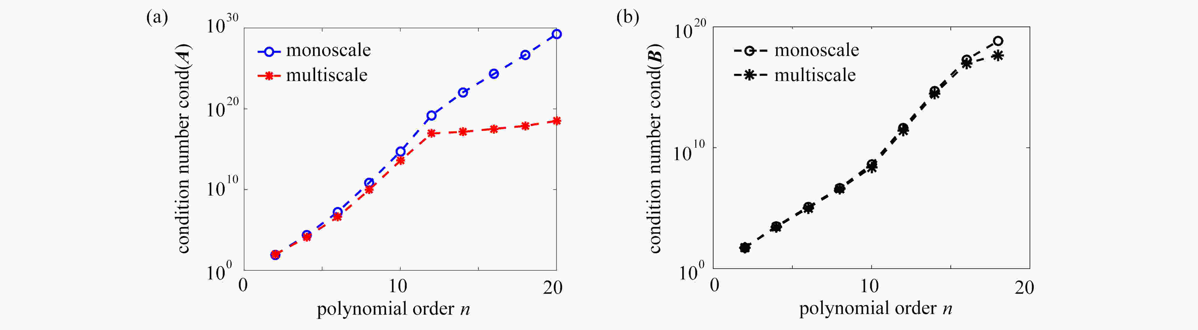 $n_{{{\rm{i}}}}=3\;819,\;n_{{{\rm{d}}}}=5\;220,\;n_{{{\rm{t}}}}=1\;919,\;{\tau}=1$ 时,两种区域多项式特解的平方根误差Table 1. The RMSE with