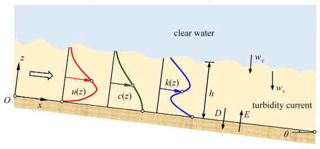Figure  1.  Schematic of the velocity, sediment concentration, and turbulent kinetic energy of the turbidity current[24, 27]